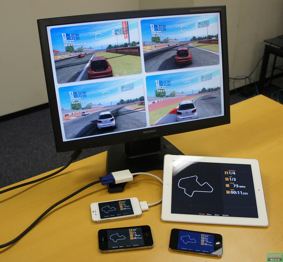 "Apple VGA 어댑터"도 미러링 가능. PC 용 모니터를 연결하면 "Real Racing2"의