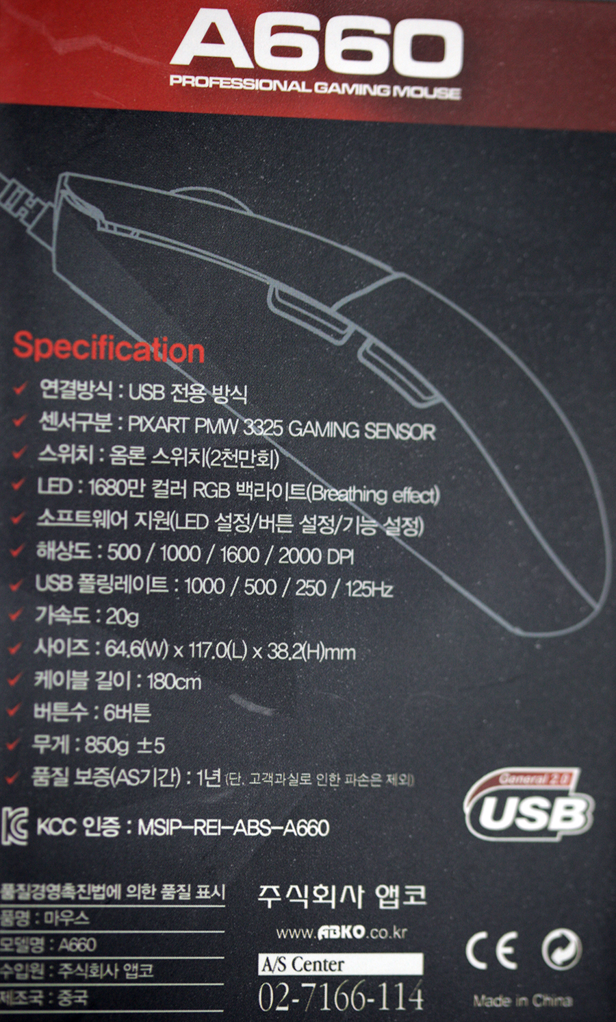 ▲ ABKO Hacker A660 제원입니다. 출시전이라 웹에서 확인할수 있는 정보가 적어 박스에 있는 부분을 올립니다. 3325 센서와 3360 센서 2가지 센서로 출시 되는것 같습니다.