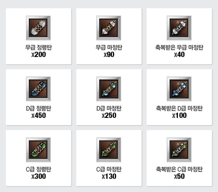 - 스피릿 붐을 통해 교환 가능한 정령탄류 아이템은 NPC 상점 구매, 제작한 아이템만 가능하며,