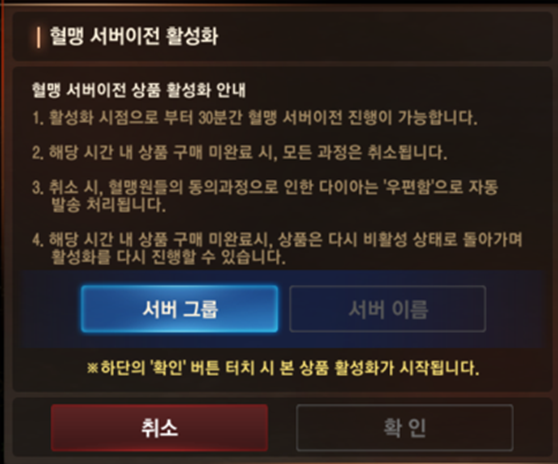 - 상품 활성화 후 30분 이내로 혈맹 군주의 최종 구매가 이루어지지 않을 경우 상품 구매는 자동 실패 처리됩니다.