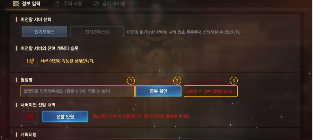 ② 중복확인을 통해 이전할 서버에서의 혈맹명 사용 가능 여부를 알 수 있습니다.