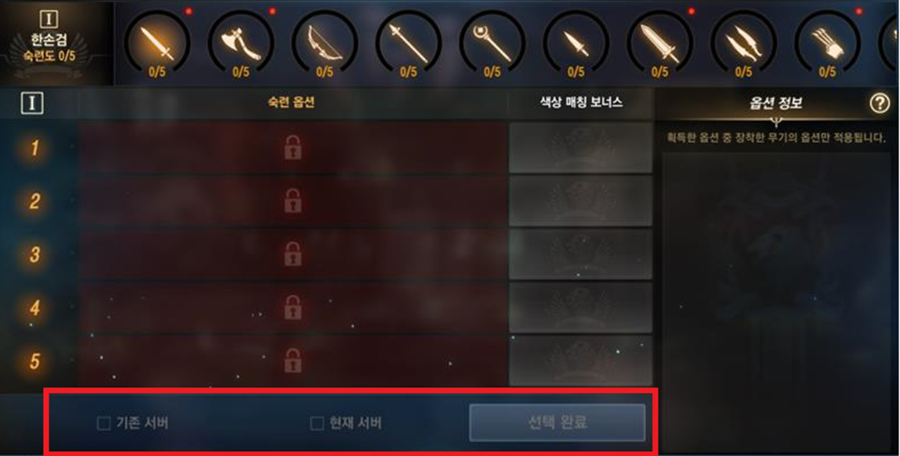 * 전/후 서버의 숙련도를 비교하여, 각 서버 중 한곳이라도 활성화된 숙련도가 존재하지 않을 경우, 활성화된 서버의 숙련도 정보가 적용됩니다.