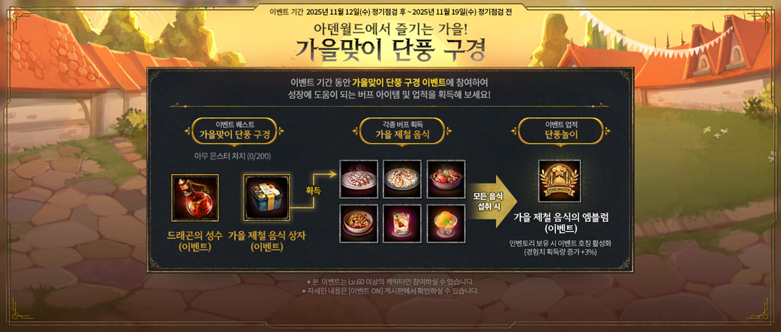 - 2025년 11월 19일 정기점검 이후, 더 이상 이벤트 퀘스트 ‘가을맞이 단풍 구경’, 이벤트 업적 ‘단풍놀이’를 수행하거나 완료할 수 없습니다.