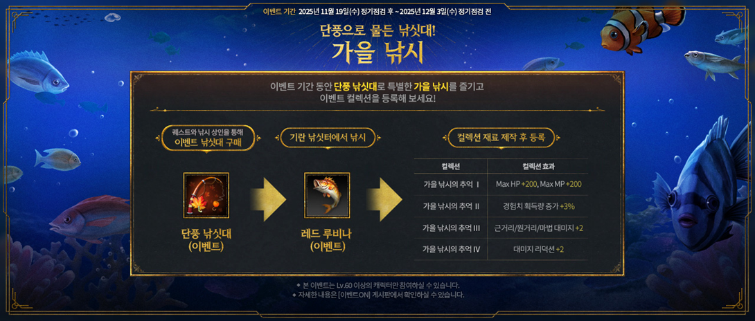 - 이벤트 기간, Lv.60 이상의 캐릭터는 계정당 주 1회 이벤트 퀘스트 ‘가을 낚시’를 수행할 수 있습니다.