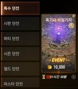 - 이벤트 특수 던전 ‘흑기사 비밀기지’의 이용 시간은 매일 기본 1시간이 제공됩니다.