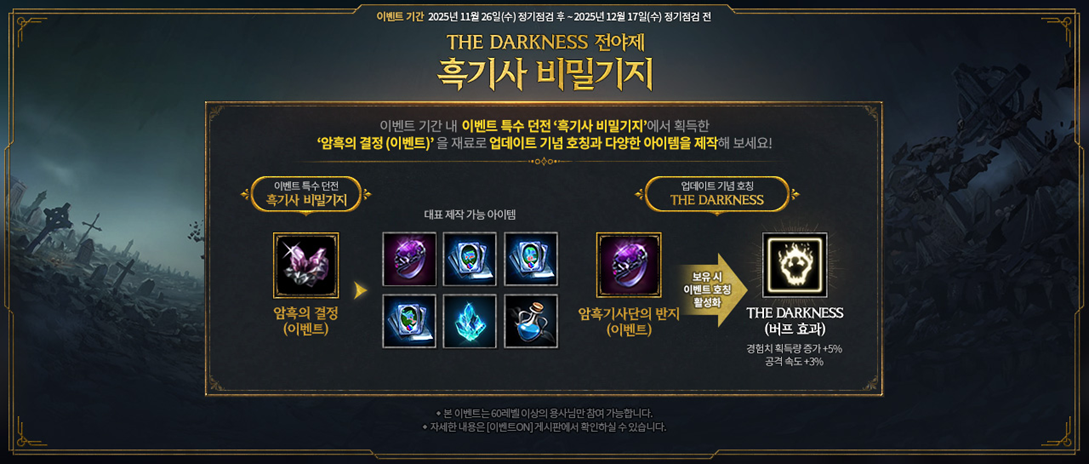 - 2025년 12월 17일 정기점검 이후, 이벤트 아이템 ‘암흑의 결정 (이벤트)’, ‘암흑기사단의 반지 (이벤트)’는 모두 삭제됩니다.