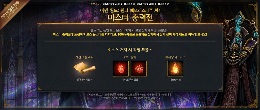 - 2026년 1월 28일 정기점검 이후, 지배의 탑, 마족들의 땅, 에오딘 성채의 보스 처치 보상은 이벤트 이전과 동일하게 제공됩니다.