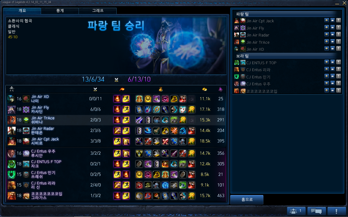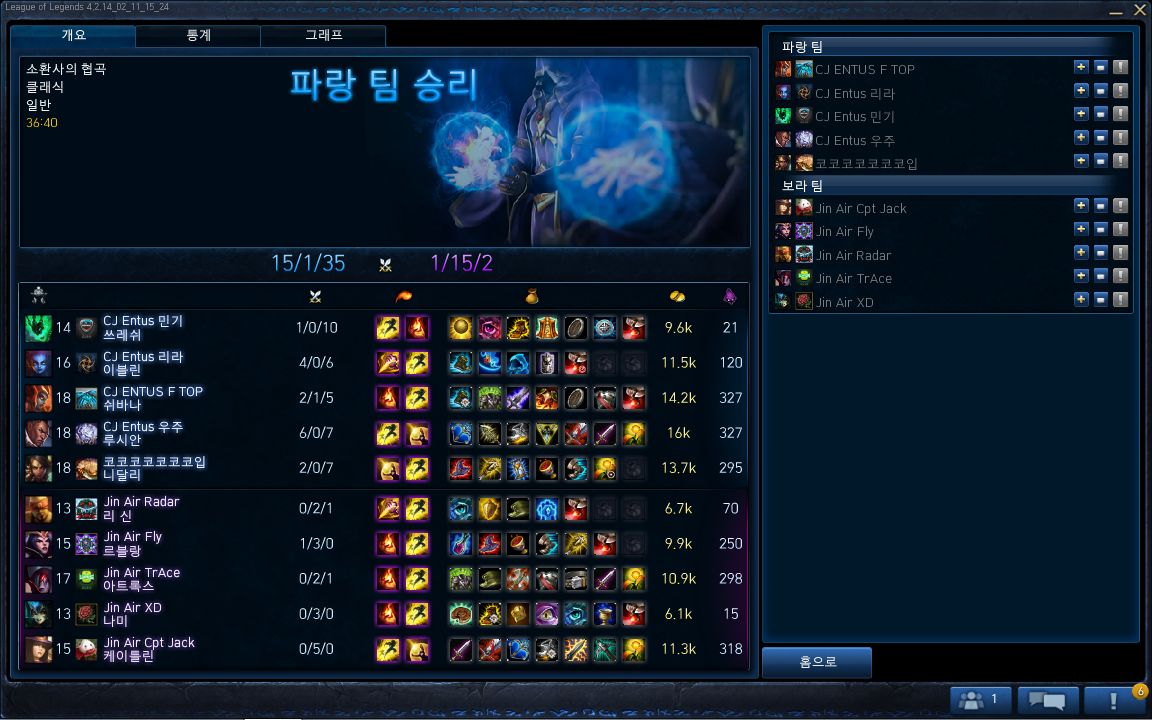결국 바론을 가져간 진에어가 탑라인 억제기를 깨며 cj를 괴멸시켰고 승리를 가져감