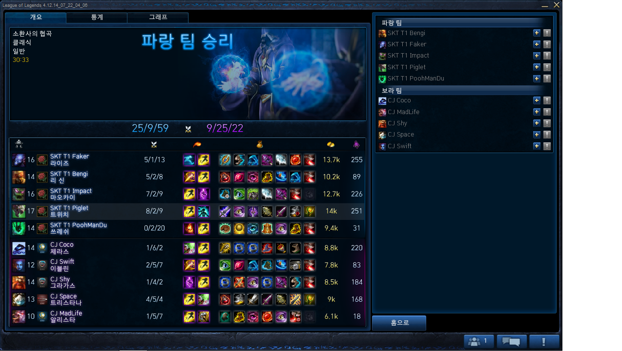 좀더 빠른 합류로 CJ가 어느정도 이득을 보며 따라잡나 했지만 SKT에게 바론을 허무하게 넘겨주고 이후의 한타에서 트위치와 코그모를 잘 노려주며 또다시 역전을 하나 했지만 잘 성장한 페이커의 코그모에게 가로막히게 됨
