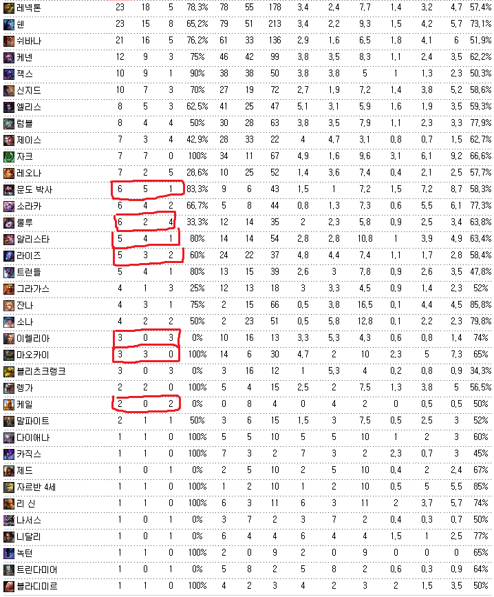 임팩트선수의 캐릭별 승률이다. 레넥톤과 쉬바나, 자크, 문도박사의 승률이 높은반면