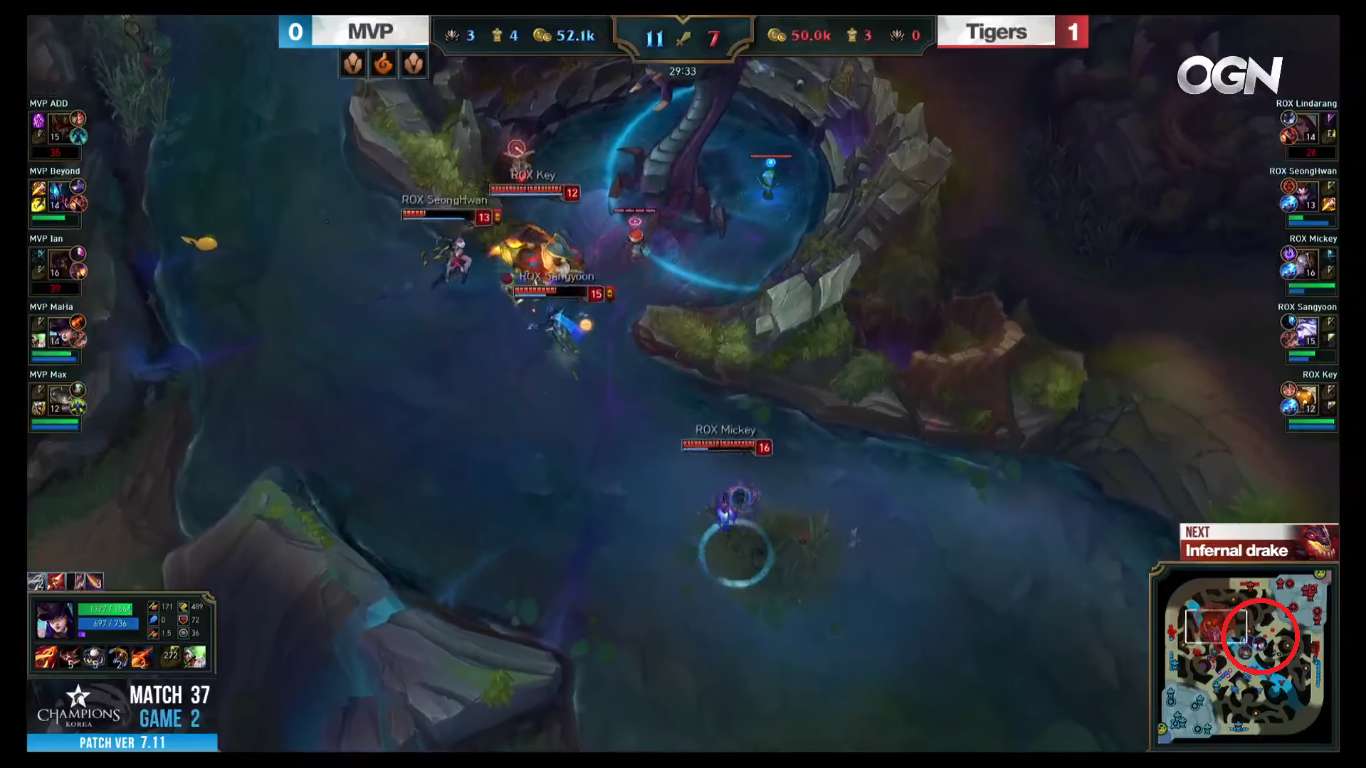 락스가 MVP 블루쪽 시야를 다 먹고, 라인을 탑 2차포탑 앞까지 밀어놓은 상황. MVP는 상대 강제이니시가 무서워 뺑 돌아서 오고있다.