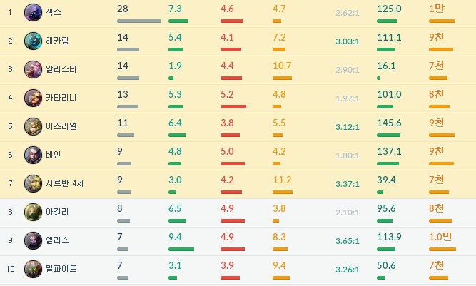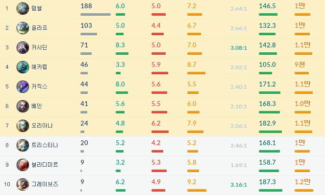 딱 보시면 아시겠지만 탱키한 챔프들은 아주 KDA가 낮습니다