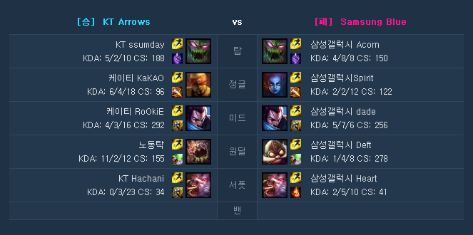 2,3경기 연패상황에서, kt의 유일한 희망은 '블라인드'였다. 삼성은 이번시즌 블라인드 경험이 없고, kt는 2번의 승리를 통해 블라인드에 꽤나 자신이 붙은상황. 그들도 분명 '이번만 버티면 이긴다' 라는 생각이 어느정도 있었을테고, 그에 대한 필살카드로 각자 잘하는 챔피언, 캐리챔피언들을 꺼내든다.
