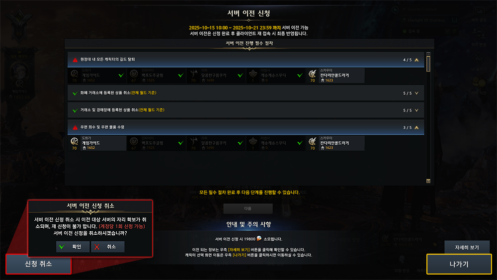 | '도착 서버'에 보유 중인 게임 정보가 존재하는 경우, 초기화 후 '출발 서버' 원정대 정보로 변경됩니다. |