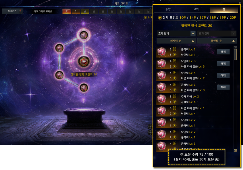 - 젬의 종류(질서/혼돈)의 구분 없이 최대 100개까지 보관이 가능합니다.