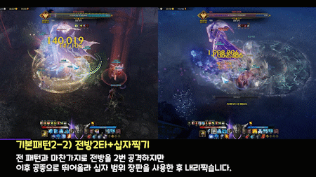 전 패턴과 마찬가지로 전방을 2번 공격하지만 이후 공중으로 뛰어올라십자 범위 장판을 사용한 후 내리찍습니다.