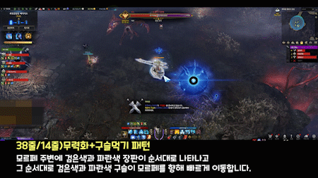 중앙으로 이동하고 힘을 모으는 모르페를 무력화 시키면 파티원 머리 위에 검은색과 파란색 표식이 랜덤하게 생깁니다.