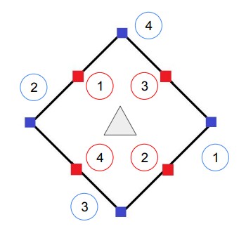 위치는 빨강이던 파랑이던 첫번째가 3시라면 두번째는 3시의 반대편인 9시 , 세번째는 9시의 반시계방향 두칸인 6시 네번째는 6시의 반대방향인 12시다.