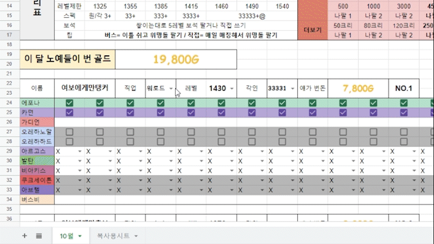 복사용 시트는 기본 캐릭터만 적어놓고 그대로 두는걸 추천