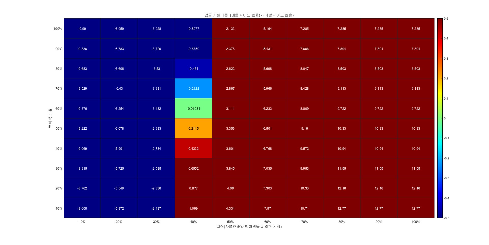 사멸 기준으로 예둔 채용이 저받에 비해 얼마나 효율이 높을지 계산해봤습니다. 값은 예둔+아드의 딜증가량 - 저받+아드의 딜증가량이며, y축은 백어택, x축은 백어택과 사멸셋 효과를 제외한 치명타확률입니다.