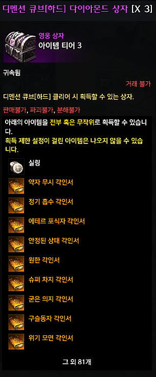 ▲ 전설 각인서를 노려볼 수 있다!던전을 클리어하면 디멘션 큐브 상자를 얻게 됩니다. 자신의 클리어 단계에 따라 상자의 이름과 보상에 차이가 있습니다.