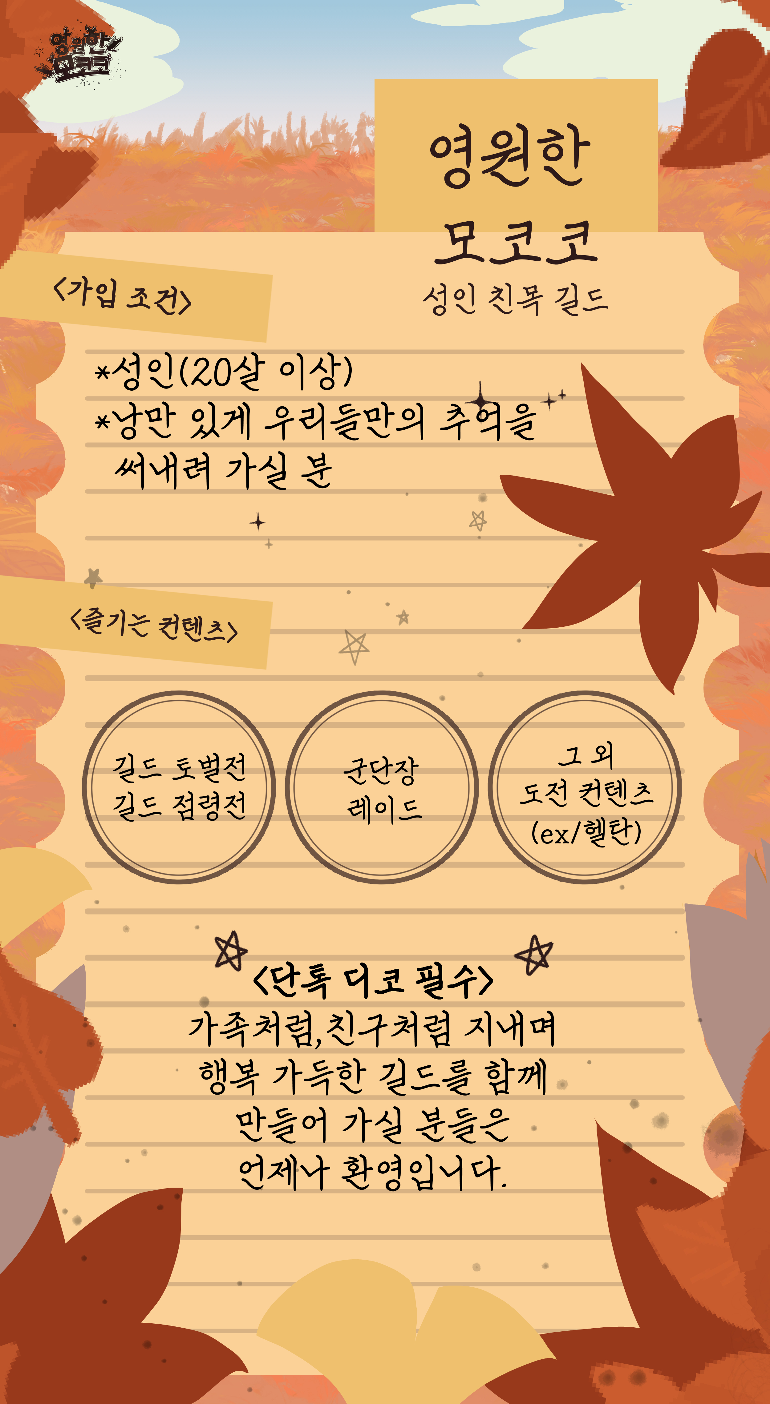 성별 나이 상관 없이 놀땐 친구 처럼 놀고, 힘들고 지치는 일이 있다면 가족 처럼 위로를 해주는, 따듯하고 낭만 가득한 길드로 함께 만들어 나가실 분 6명을 모집 하고 있습니다!