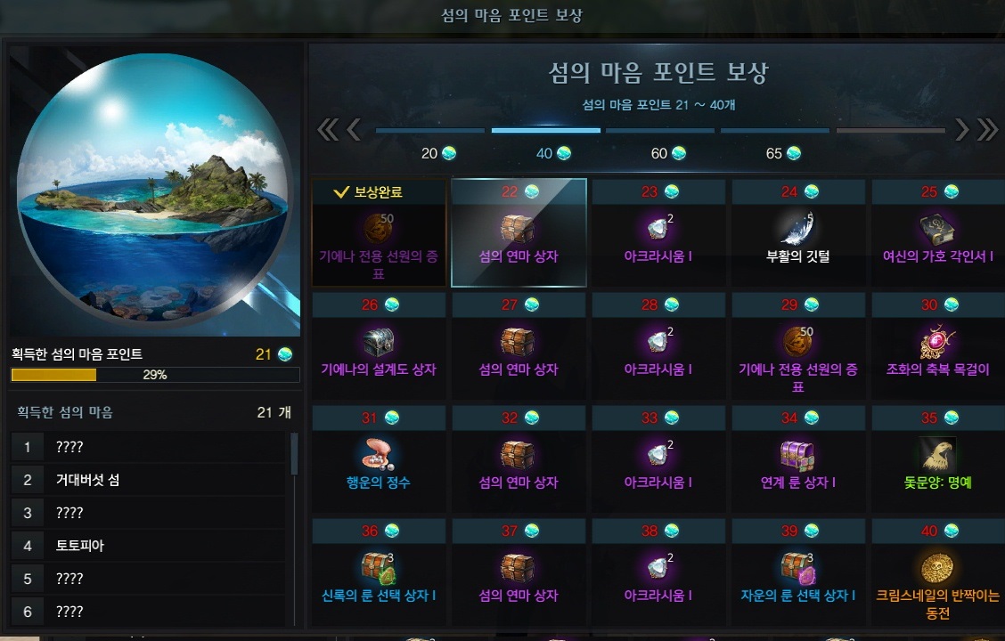 섬의마음 1개~40개까지 보상을 올려봤습니다.