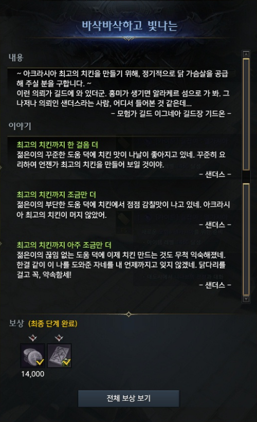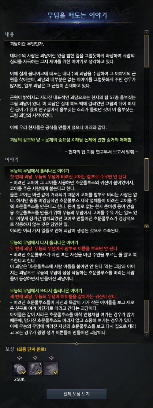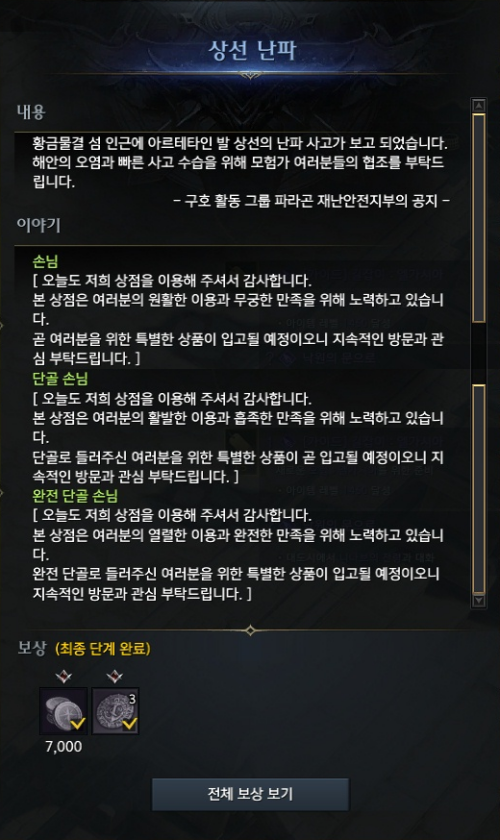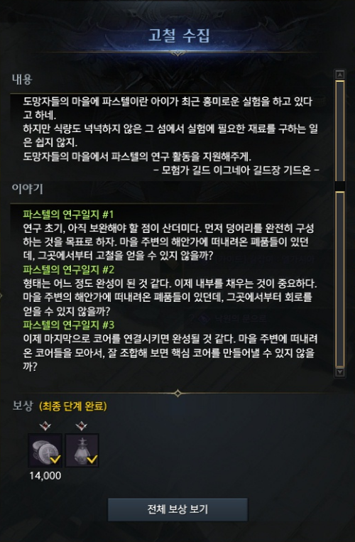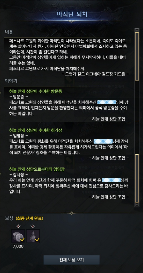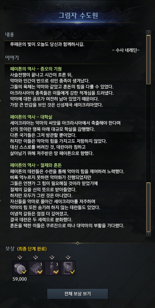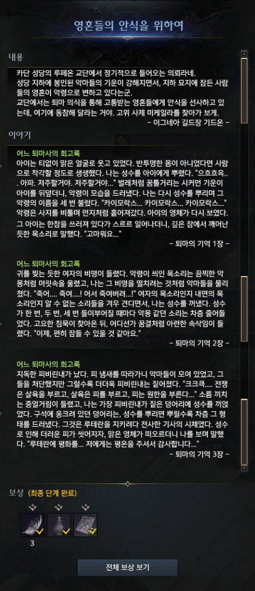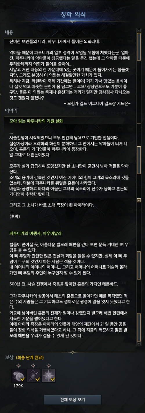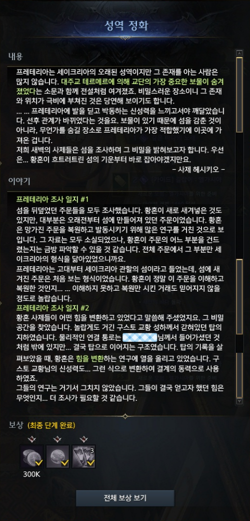 84 성역 정화 길드 / 국가 세이크리아 / 도시 / 장소 프레테리아 섬 인물 사제 헤시키오 / 대주교 테르메르 / 아만 / 교황 구스토 키워드 오래된 성역 / 신성력 / 새벽 / 황혼 / 실마엘 / 고대 주문 / 탑 / 힘의 변환 평판 완성 업적 [신들이 당신을 축복합니다]