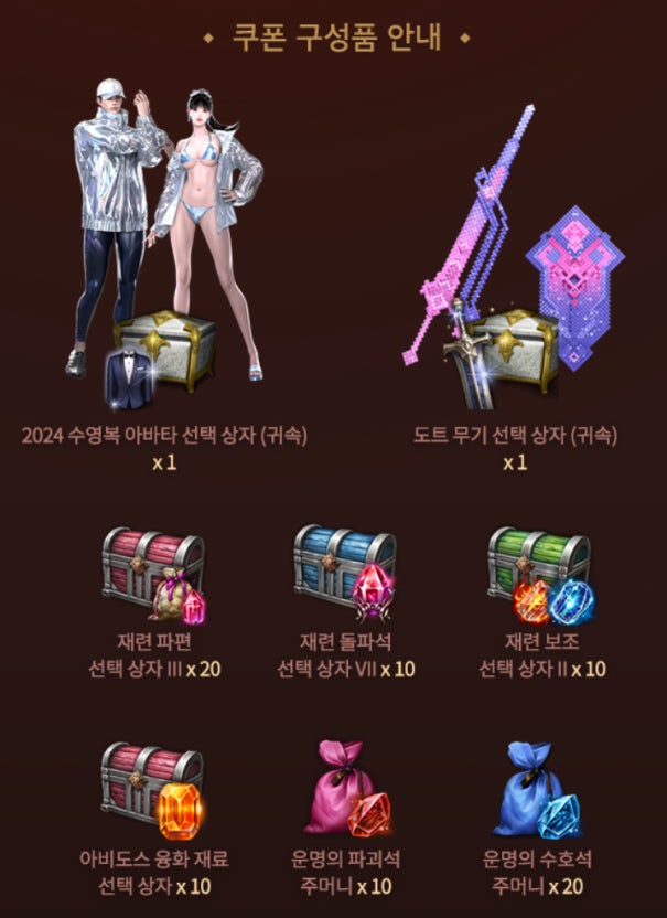 또 다른 관례로 로스트아크는 수영복 아바타 출시 때마다 수영복 아바타 쿠폰을 주었다. 2023,2024년 동일.