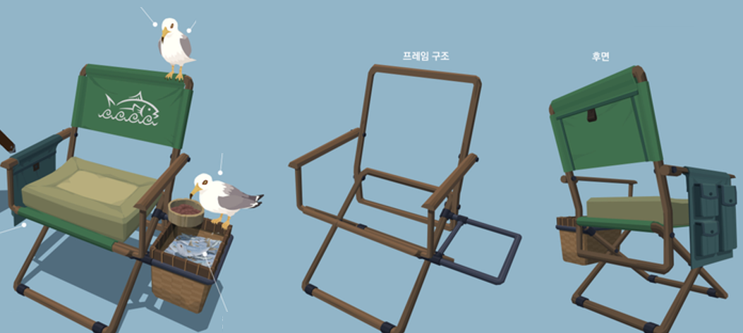 의자에 앉아 낚시를 즐길 수 있으며, 주변에는 갈매기가 날아와 함께하는 모습이 연출되어