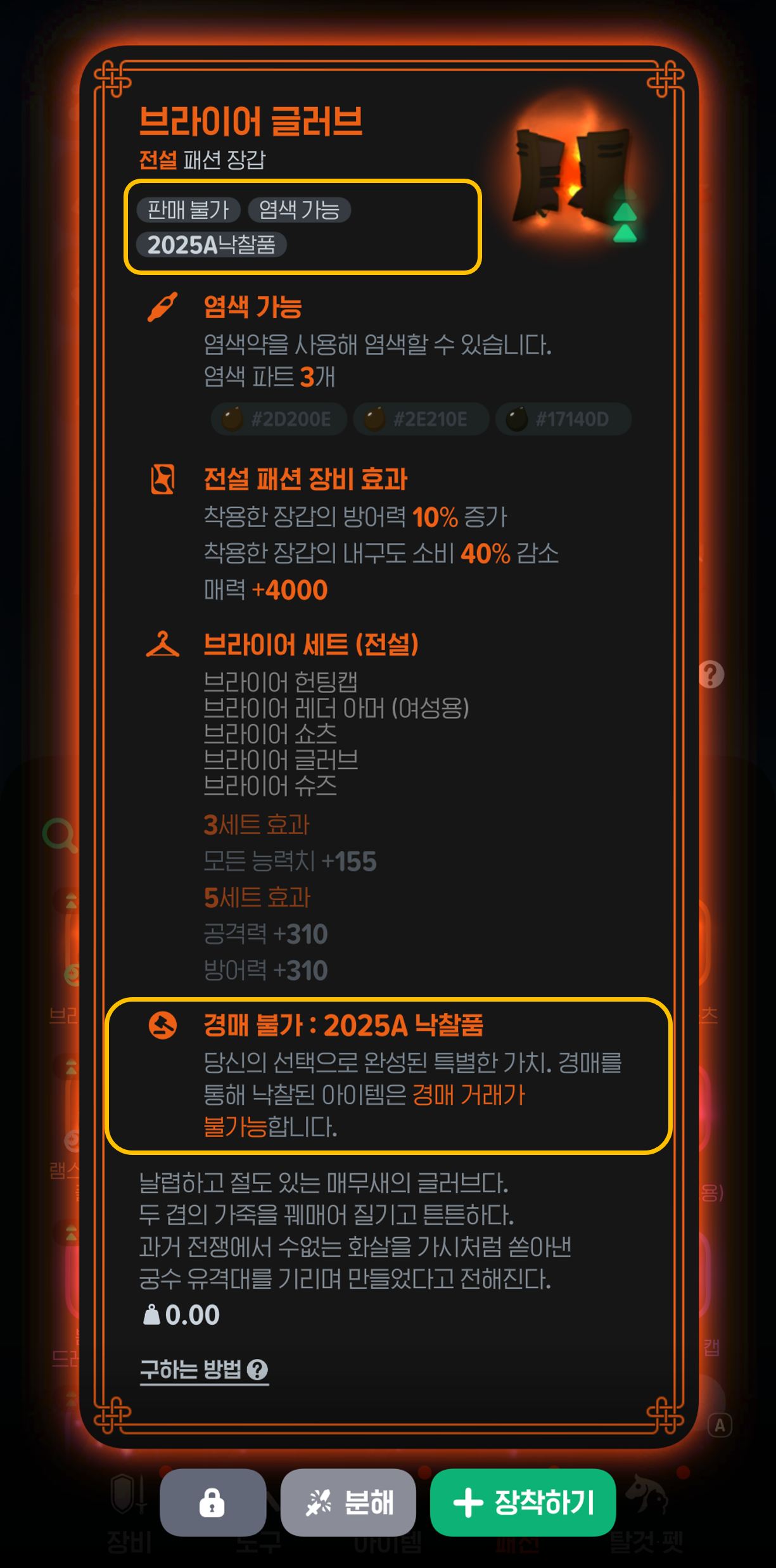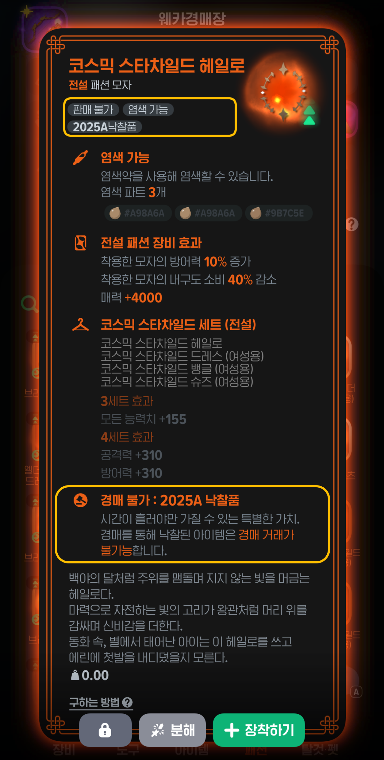 전설 희귀도의 빈티지 | 연금술-패션 장비 합성 | 최초 출시일로부터 120일이 지난 후 판매 가능 |