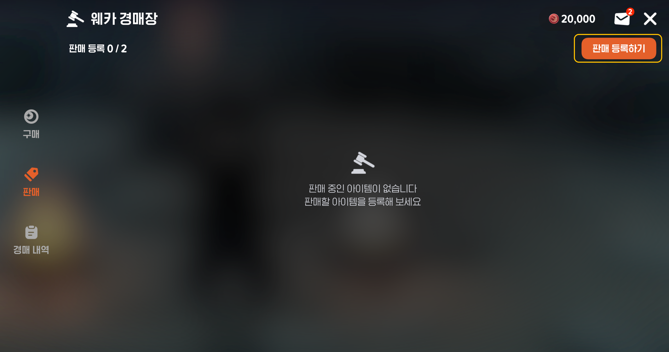 ① 웨카 경매장 판매 탭에서 판매 등록하기 버튼을 선택합니다.