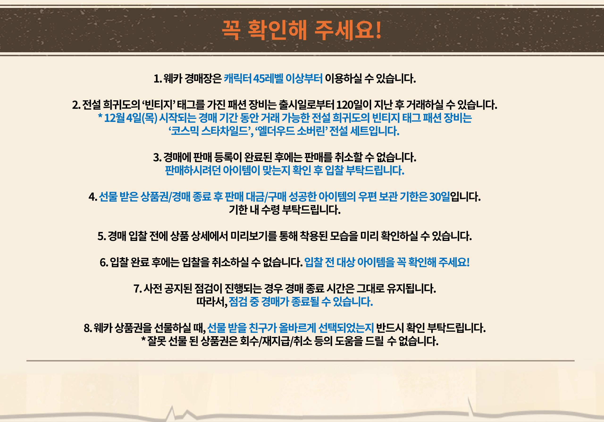 * 웨카 경매장은 캐릭터 레벨을 45레벨 이상 달성하신 경우 이용하실 수 있습니다.