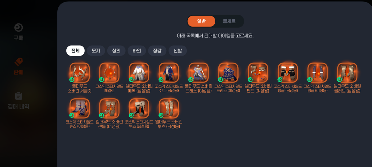 판매 | 보유한 아이템을 경매장에 직접 판매 등록하는 것을 의미합니다. 판매 시 진행 시간, 시작 가격, 개별/풀세트 여부 등을 설정하게 됩니다. 단 한 번도 경매 참여가 시작되지 않아 거래가 실패한 상태로 경매가 종료될 시 판매에 실패하게 됩니다. |
