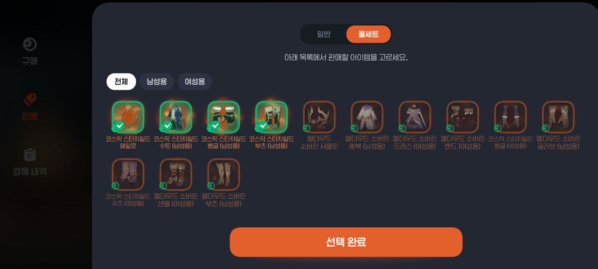 ④ 풀 세트 판매 등록 시 풀 세트 전체가 1개 슬롯에 등록됩니다.