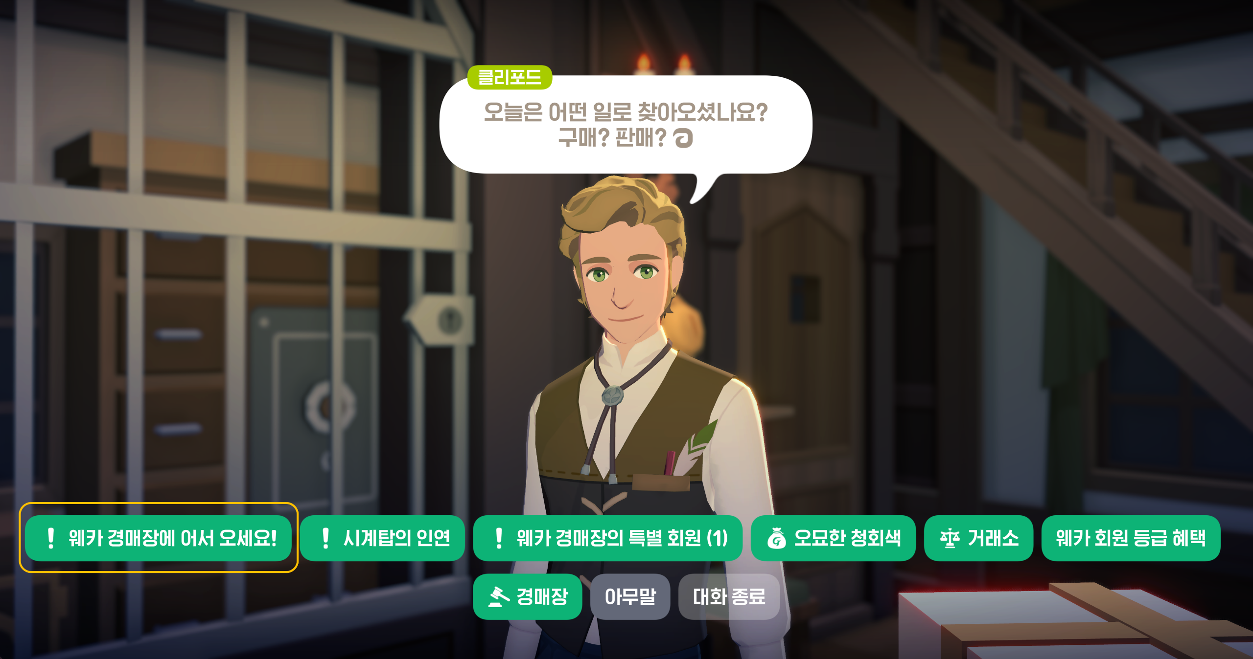 - [메뉴(≡)] → [웨카 경매장(Beta)] 메뉴를 통해 진입하시거나, 던바튼 NPC 클리포드와 대화하여 이용하실 수 있습니다.