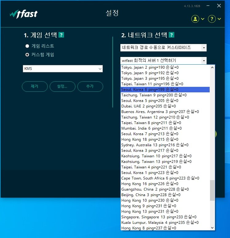 저 중에서 Seoul, Korea 중 핑이 가장 낮은 서버를 선택하시면 됩니다.