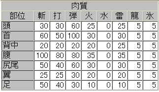 <가노토토스의 육질. 배는 절단, 목은 탄이 강한 걸 알 수 있으며, 속성은 뇌속과 화속을 가장 잘 먹는 것을 알 수 있군요>