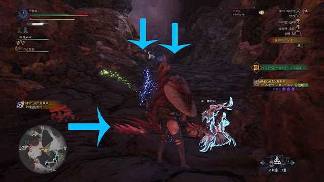 이곳엔 크샬발톱과 네르가시가 겹쳐있고 아래 화살표에 테오의 체모 왼쪽화살표 방향에 네르가시가 있습니다.