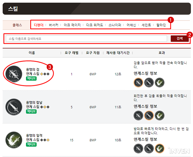 상단 필터에서 클래스를 선택하면 해당 클래스의 스킬 정보가 리스트에 표시됩니다.