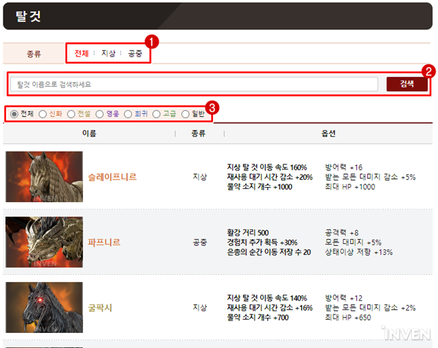신화부터 일반까지 등급별 필터를 통해 탈 것을 확인할 수 있습니다.