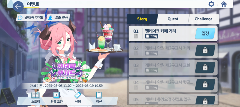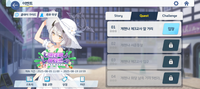 에피소드를 확인할 수 있는 ‘스토리’, 보상과 관련된 ‘상점’, ‘미션’, ‘보물찾기’, ‘후일담’ 등의 메뉴로 구성되어 있습니다.