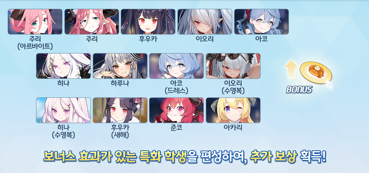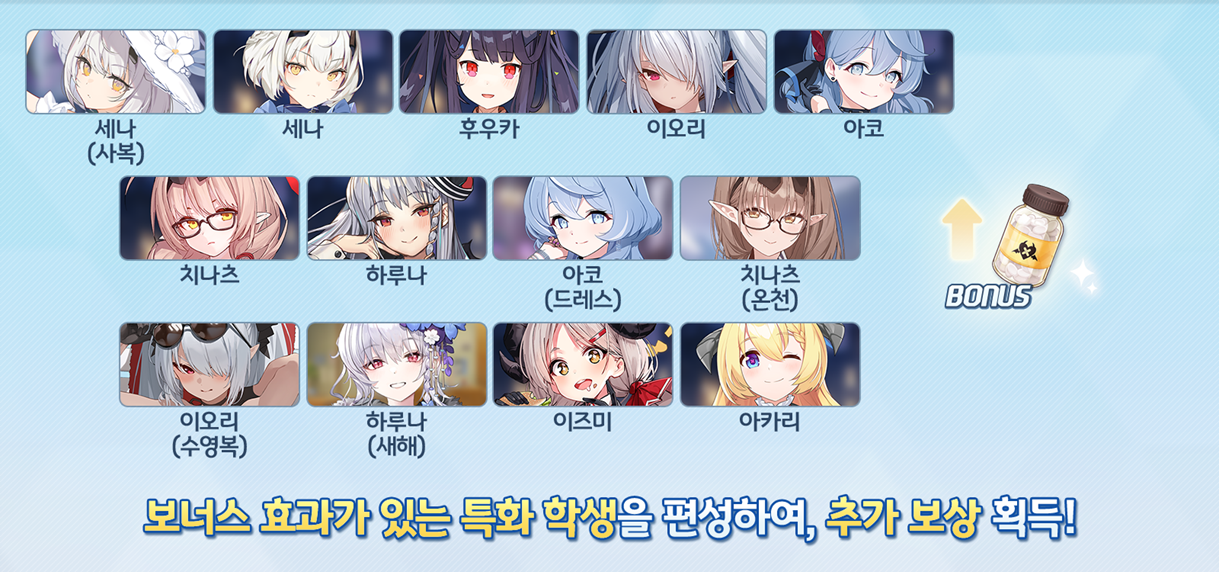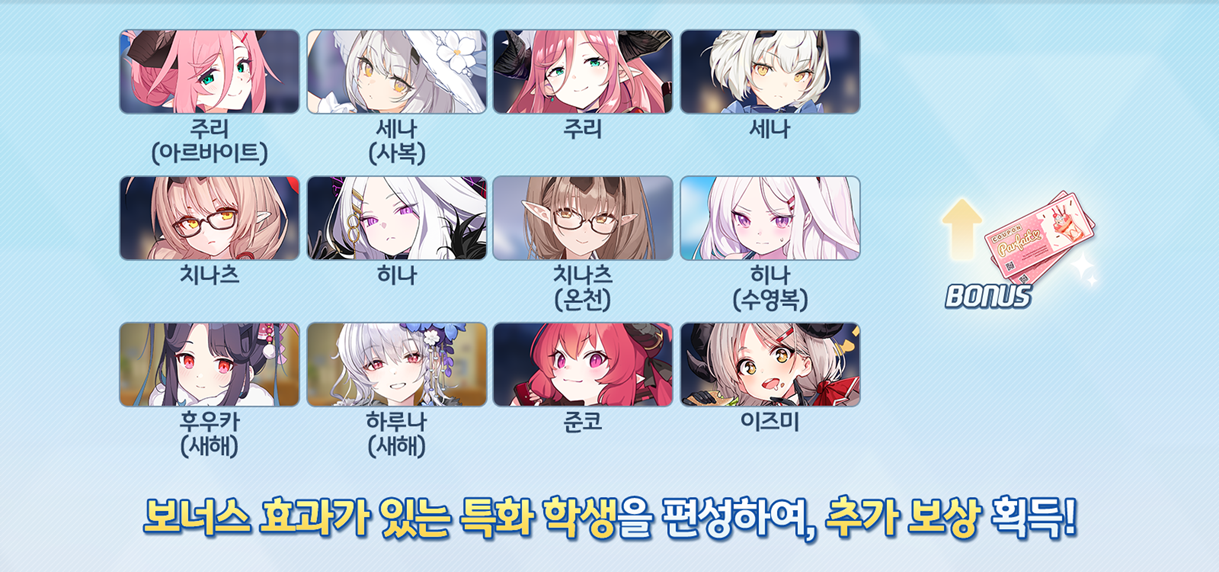- 이벤트 재화별로 추가 획득 보너스가 있는 ‘특화 효과 학생’이 있습니다.