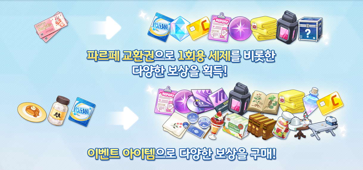 - ‘스토리(Story)’, ‘퀘스트(Quest)’ 클리어 등으로 획득한 이벤트 재화를 사용하여, 경품 교환소의 아이템과 교환할 수 있습니다.