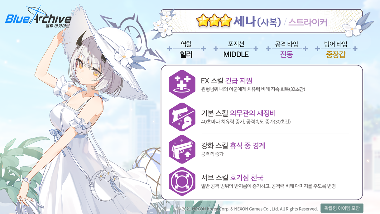 - 세나(★3, 사복) 픽업 모집 일정: 8월 5일(화) 점검 후 ~ 8월 19일(화) 오전 10시 59분