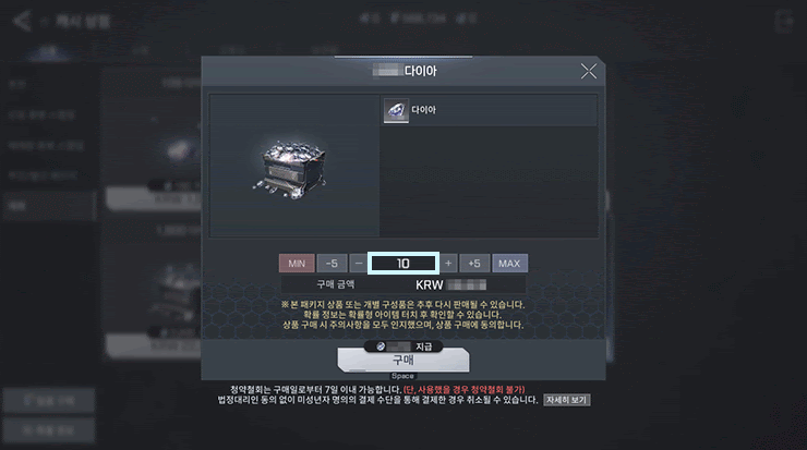 * 다이아 상품만 다중 수량 결제가 가능하며, 용병님께서 구매하시는 상품 가격대에 따라 한 번에 구매할 수 있는 수량이 상이합니다.