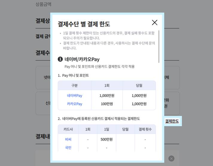 * 결제 한도 확인 방법: 상품 및 수량 선택 → 결제 화면 → 결제 수단 선택 영역의 ‘결제 한도’ 클릭