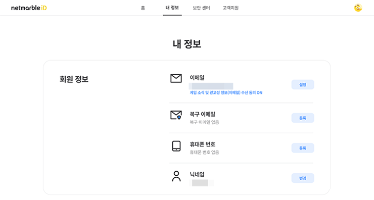 - 복구 이메일 : 넷마블ID를 분실할 경우, ID를 찾을 수 있는 수단으로 복구 이메일을 등록/변경할 수 있습니다.
