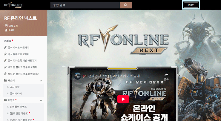 1. RF 온라인 넥스트 포럼 우측 상단의 [로그인 ▶ 넷마블ID로 로그인 ▶ 회원가입]을 선택하거나