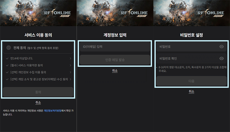 2. 서비스 이용에 동의한 후, 사용 중인 이메일 인증 및 비밀번호를 설정하면 회원 가입이 완료됩니다.